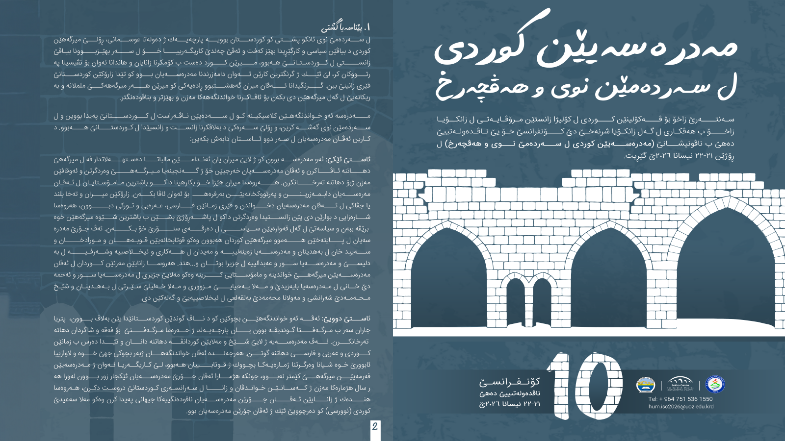 سەنتەرێ زاخۆ بۆ ڤەکۆلینێن کوردی ل كۆليژا زانستێن مرۆڤايهتى-زانكۆيا زاخۆ ب هەفکاری ل گەل زانکۆیا شرنەخێ،دێ کۆنفرانسێ خۆ یێ ناڤدەولەتییێ دەهێ ب ناڤونیشانێ “مەدرەسەیێن کوردی ل سەردەمێن نوی و هەڤچەرخ ” ل ڕۆژێن “٢١-٢٢ يێ نيسانا ٢٠٢٦ێ” گێڕيت.