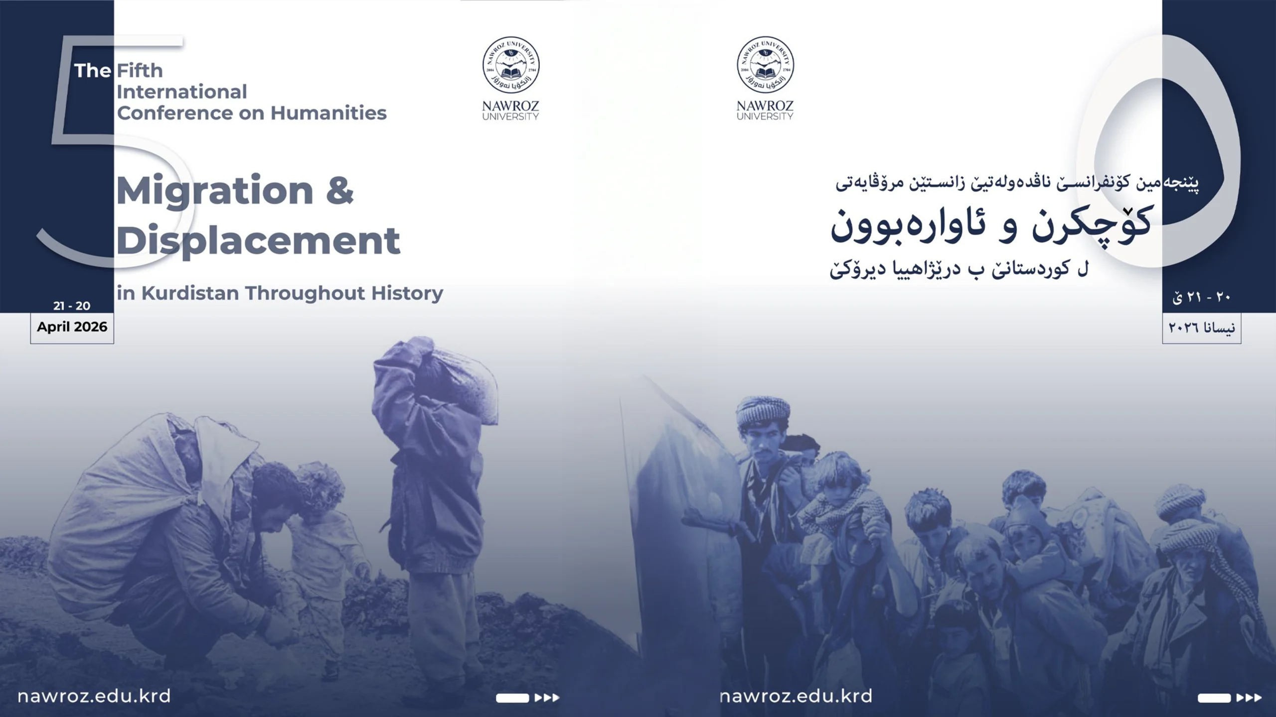 زانكۆیا نەورۆز پێنجەمین كۆنفرانسێ ناڤدەولەتیێ زانستێن مرۆڤایەتی ب ناڤێ: “كۆچکرن و ئاوارەبوون ل کوردستانێ ب درێژاهیا دیرۆکێ” رادگەهینیت، کو دێ ل رۆژێن 20 – 21 نیسانا 2026 ل زانکۆیا نەورۆز هێتە گێران. بۆ زانیاریێن زێدەتر ل دۆر پۆختە و دەم و رێکەفتێن گرنگ یێن کۆنفرانسی ب هەرسێ زمانان، لینکێن ل خوارێ کلیک بکەن: